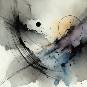 DALL·E 2024-09-19 11.02.18 – An abstract ink and watercolor artwork representing the theme of ‘Hope without Optimism.’ The composition uses somber tones of gray, deep blue, and mu